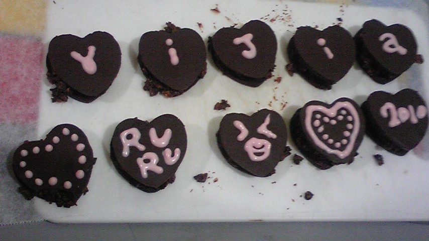 無奈遇過年期間無法與他相見, 這巧克力也一路放到2月底了. 做法真的超簡單的 ![]() ![]() (說明書寫的非常清楚)1. 將巧克力隔水加熱融化後, 平鋪在放了烘培紙的棧板上 置入冰箱10分鐘, 用內附的愛心模型 壓出形狀 有時候會壓裂, dont mind!! 等一下再融巧克力一次, 重複步驟1就好了 壓20個, 花了30分鐘, 呼~ ![]() 2. 將剩下的巧克力, 隔水再融一次, 倒入內附的玉米脆片攪拌 (後來做完時, 挖剩下的來吃. 挖, 好吃!! )3. 將巧克力玉米碎片放在愛心上面(10個) 4. 合體!! 將另一片塗上一些融化的巧克力, 放在放了玉米碎片的巧克力片上 用內附的粉紅色巧克力筆寫字 or decoration 5. 用內附的透明小塑膠袋跟束口線綁好, 裝在包裝袋or盒子裡, 可以送人囉!! 最好裝在盒子裡, 我裝在袋子裡, 愛心巧克力片有點碎掉了 ![]() ![]() 送禮效果...很讚喔... ![]() 兩個人一起吃^^ ![]() 除了巧克力有點甜, 巧克力玉米碎片讓口感更好. 雖然是自我滿足的東西, 不過幸好他都很捧場. 從以前到現在的焦黑的餅乾, 頭重腳輕的怪圍巾, 碎掉的巧克力....... how lucky i am ![]() PR